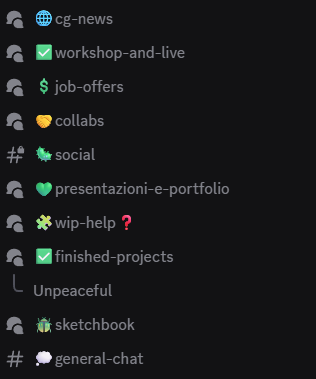Nei canali come ✅finished-projects o 🧩wip-help❓ puoi parlare con altri artisti, chiedere consigli o semplicemente mostrare i tuoi lavori finiti.